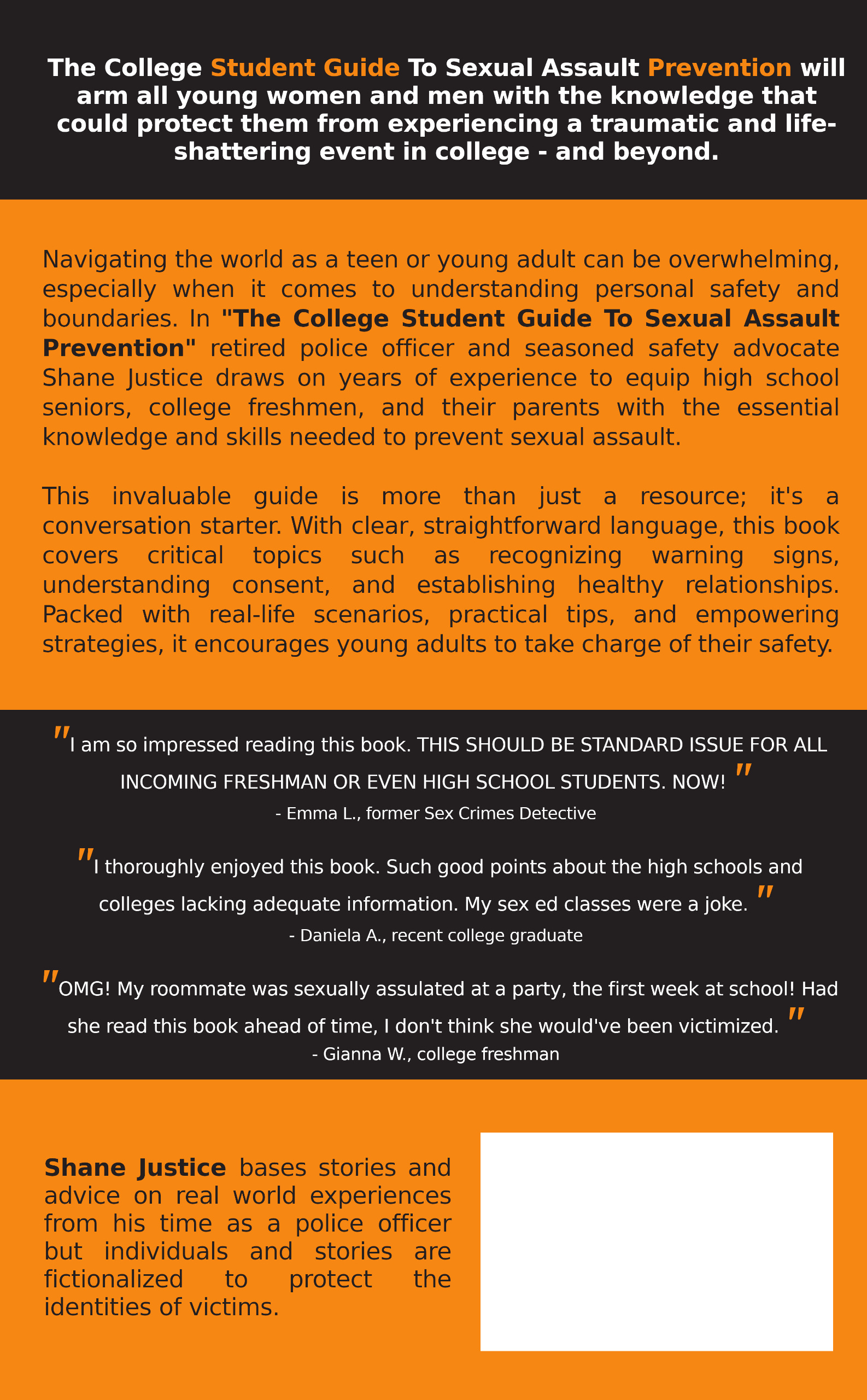Navigating the world as a teen or young adult can be overwhelming, especially when it comes to understanding personal safety and boundaries. In "The College Student Guide To Sexual Assault Prevention" retired police officer and seasoned safety advocate Shane Justice draws on years of experience to equip high school seniors, college freshmen, and their parents with the essential knowledge and skills needed to prevent sexual assault.This invaluable guide is more than just a resource; it's a conversation starter. With clear, straightforward language, the book covers critical topics such as recognizing warning signs, understanding consent, and establishing healthy relationships. Packed with real-life scenarios, practical tips, and empowering strategies, it encourages young adults to take charge of their safety while fostering open dialogues with parents and guardians.Buy Now On Amazon